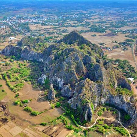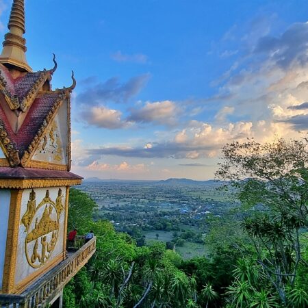 After lunch, we'll head to Phnom Sompov Mountain, which stands approximately 140 meters high with over 800 steps to the top. To save some of the climb, you can ride a pickup truck partway up and then visit the temples, shrines, and "killing caves" from the Khmer Rouge era. Once at the summit, you'll enjoy a breathtaking view over all of Battambang and marvel at the expansive and beautiful landscape.